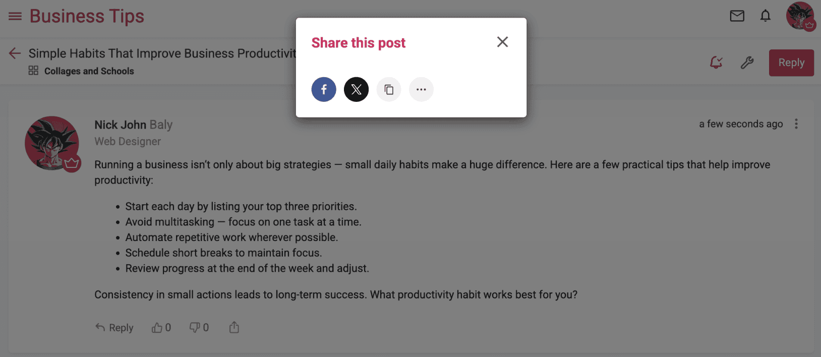Puedes compartir una publicación de tu foro en Facebook, X o cualquier otro lugar siguiendo las instrucciones que se indican a continuación: